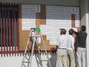 ![]() 沢山の方から沖嶋社、愛宕社に御神前やお供え物が奉納され、公民館の表には、奉納者ご芳名を掲示します |