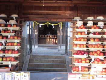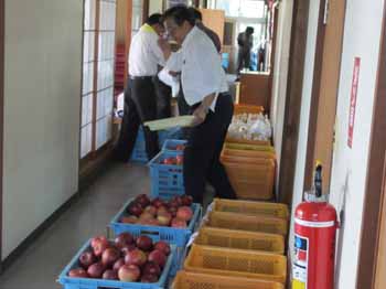 ![]() 氏子の皆さんからのお供え物の餅、果物、御神酒 等々を奉納します。きれいに並べて名札付けの作業も大変 |