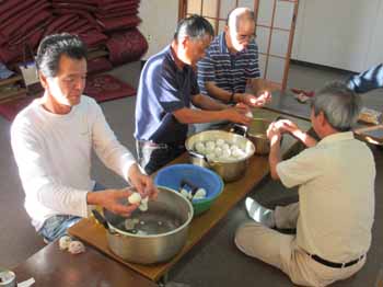 ![]() 13日の振る舞いの準備。おでん用のゆで卵の皮をむきます。数が多く、剥きにくいのもあって大変 |