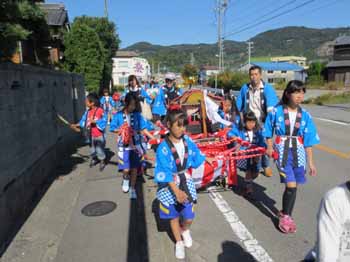 ![]() 子供御輿が中柴地区の町を練り歩きます。少子化で担ぎ手が少なくなってきて、御輿用の台車を作ったので少し楽になりました |
