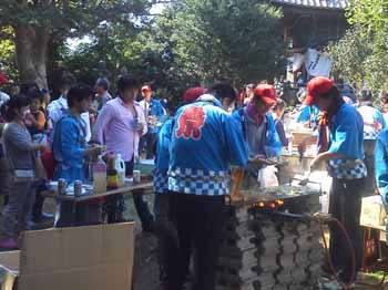 ![]() 島に渡り参拝した後は、おでん、焼きそば、ビール、ジュース、ヤクルト、おにぎり・・・振る舞いがあります。写真は焼きそばを作っているところです。久々の島で、秋晴れの祭礼を満喫します |