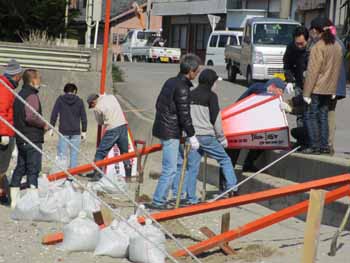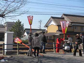 ![]() 奉納の雪洞を設置します。2週間にわたるので、番線で丈夫に取り付けます。東幡豆駅前にも取り付けます。また、占用申請等の手続きも大変でした |