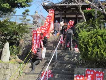 ![]() 塚越観音堂には、千本幟を取り付けます。奉納は96本です |