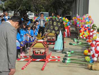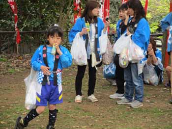 餅投げが始まりました。子供会からの餅投げです。餅や菓子袋が舞っています