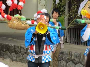 次は、担ぎ手が投げます。大人ですから餅に勢いが付きます