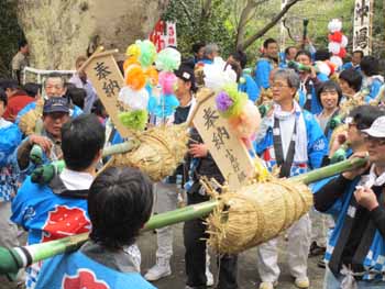 第一の鳥居をくぐって、登り坂が続きます。木遣節で勢いを付けます |