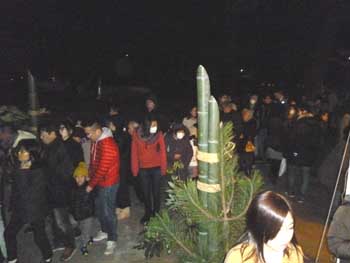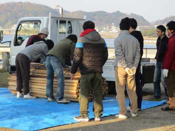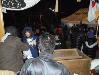 ![]() 暖を取る薪がトラックで届きました。この薪で深夜参拝者の暖を確保できます |