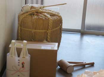 ![]() 振る舞いの酒樽でまだコモが巻いてあります。杉の香りの御神酒が楽しみです |