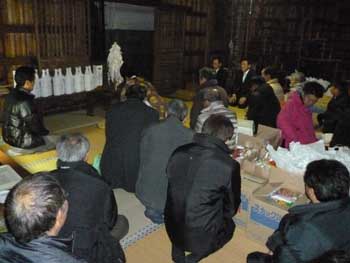 | 2015年の新年を迎えるために、31日大晦は、来年厄年の3名による、新年の準備から始まります。厄年は昨年と同じ少なく3名です。 元旦を迎える0時近くになると、ここ小見行組の氏神さんである津嶋社への参拝者が増えます。天気は曇っていましたが、沢山の人の参拝がありました。振る舞いは「お酒」、「おでん」、「ぜんざい」と厄払いの「記念品」です。 厄年を迎えた3人の無病息災と小見行組のみなさんのご健康ご多幸をお祈りします。 新年あけましておめでとうございます。小見行組氏子のみなさんのご健康ご多幸をお祈りします。 また、新年1月4日(日)には、毎年行われる小見行組の私設消防団の出初め式があります。日頃の訓練の成果を小見行組の役員や組員に見てもらいます。 常日頃は、ポンプの点検や訓練を実施しています。小見行組は山林が多く、いざ火災の時は、消防署だけでなく私設の消防団として活動します。また、地域の防災活動や子供会と一緒に防火活動もしています。 |