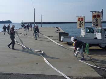![]() エンジンスタート、放水開始。後はポンプ連結放水訓練をして終了です。常日頃の点検、訓練ご苦労様です。組内の防火、防災のためよろしくお願いします。 |