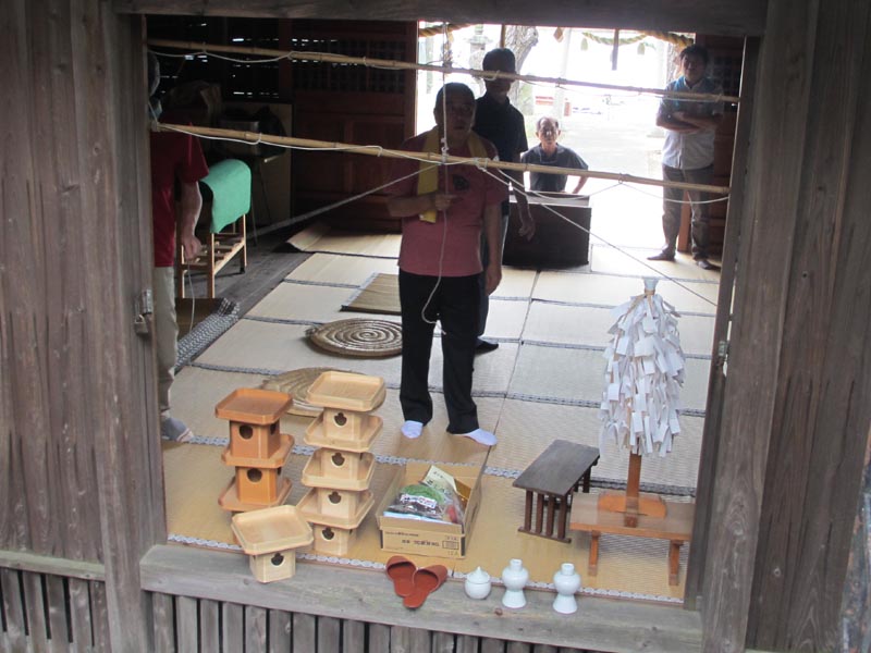 雨天モードで拝殿の中に天の字の提灯用の竿を準備します |