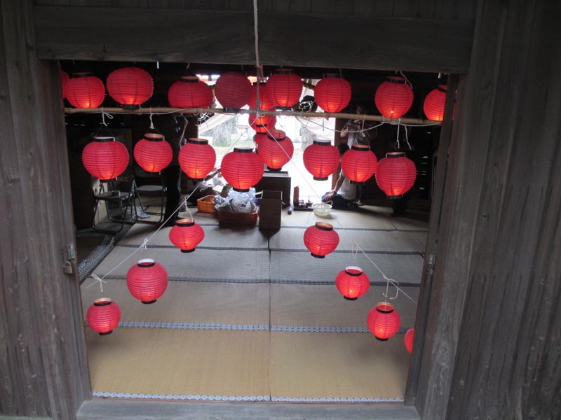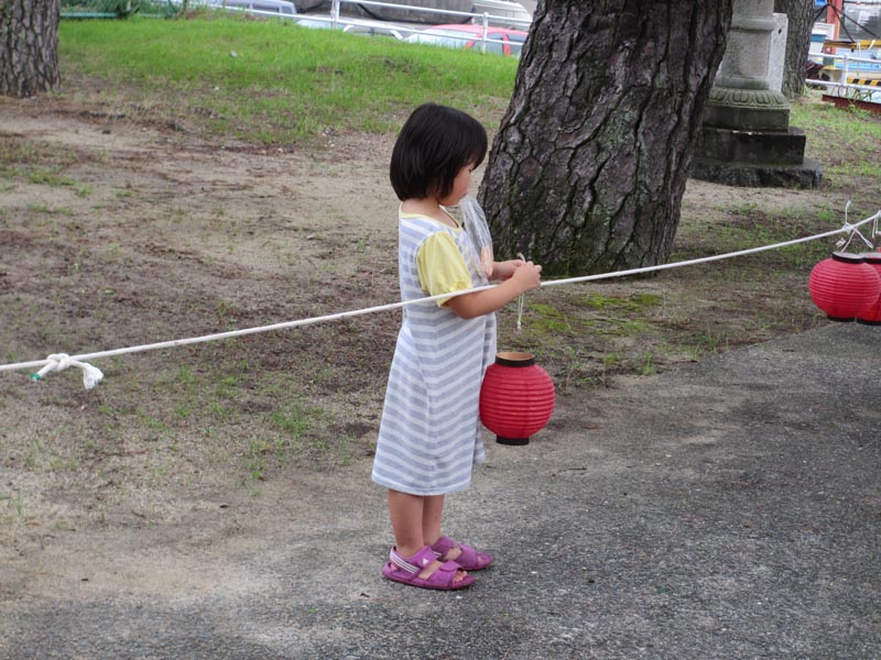 雨が上がりました。参拝の後。ローソクの火がついた提灯を受け取って、ロープに吊します