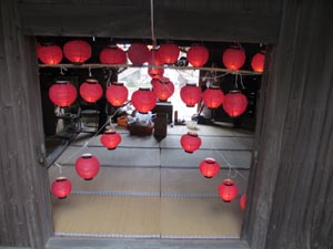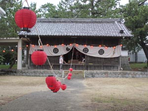 (外では行わずに拝殿の中に小さな天の字を作る)屋外の提灯は止めて、屋内の小さな天の字の提灯にすることにし、