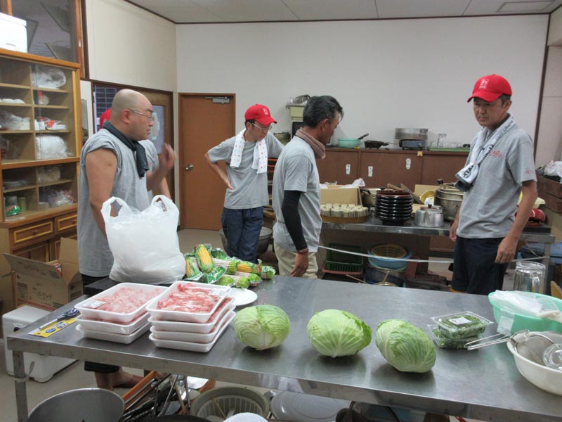 公民館調理室では、焼きそば等の材料の準備です。キャベツは今からみんなで、まな板・包丁で頑張ります