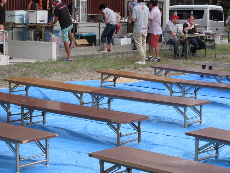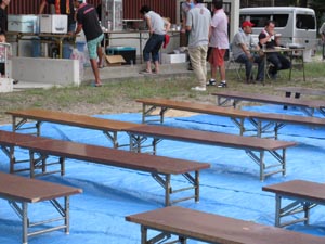 公民館前の広場にブルーシートの上に机を並べての会場になります。準備完了