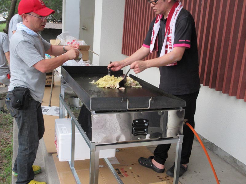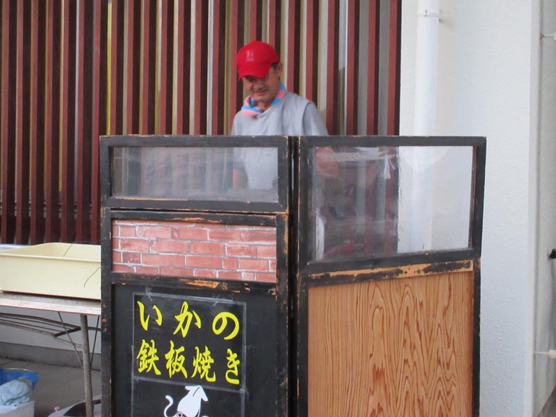 東幡豆駅前で営業している煎餅の「中新」の大将が出前で「いかの鉄板焼き」のサービスです。人気ですぐなくなってしまいます。 そのほかにも、「缶ジュース・ヤクルト」「そーめん」等が店を開いていました。もちろんすべて無料です