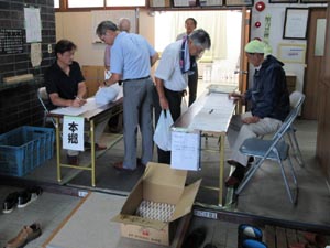 12日の9時に玄関でご神前・ご供物の受け付けを始めました。氏子の皆さんは、大雨の中、公民館を訪れます