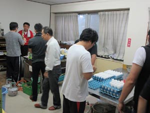 公民館厨房では13日に振る舞う「おでん」焼きそばの準備です。写真の右は、卵がずらり沢山ならんでいます |
