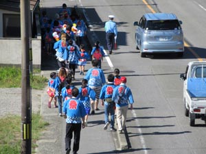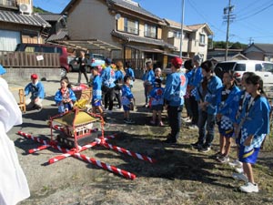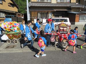 お祭り2日目の朝、風は強いが快晴子供神輿の出番です。本郷組と中柴組の2台が出ますが、写真は今年も本郷組組長宅で出発式の様子です