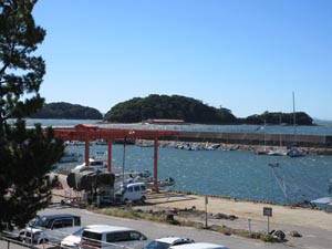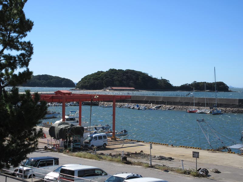 公民館2階からの海です。左端に見えるのが沖嶋です。沖嶋へは強風で渡船がでないので、公民館2階から沖嶋を望んで式典が行われます