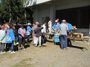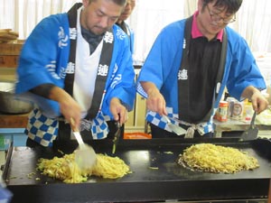 振る舞いは愛宕会と津嶋会が担当です。焼きそばを作る手つきは慣れたものです