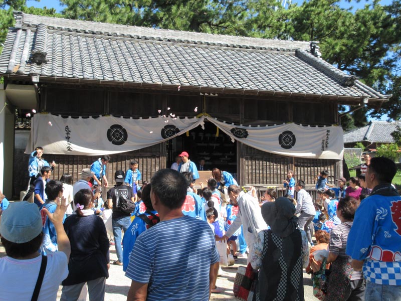 大人が談笑している間に、津島社拝殿前で、子供餅投げがあります。本郷の子供が中柴の子供に、後半は中柴の子供が本郷の子供に投げます。大人は後ろで、おこぼれを拾います。写真では、餅が結構舞っています。また、小見行のみなさんが1年安泰でありますよう祈念して、大祭が終わりました