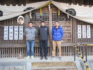 午後4時の撮影です。厄年を迎える小見行組のメンバーですこの4名です。1人は仕事の関係で撮影に間に合わず、囲みの顔写真になりました。今から最終準備です