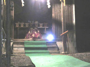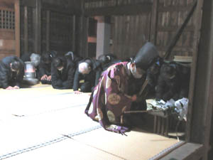 寒く薄暗い本殿ですが、宮司さんにより祝詞奏上があります。小見行組内氏子の安泰が祈念されます |