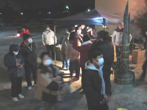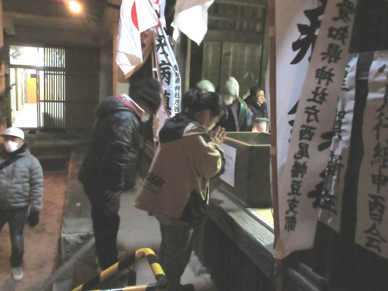 来る新年に厄年を迎える厄年会(4名)による厄払い行事の最終準備です。元旦を迎える0時近くになると、ここ小見行組の氏神さんである津嶋社への参拝者が増えます。今年は、例年にはない、もう見慣れたマスク姿での参拝です。