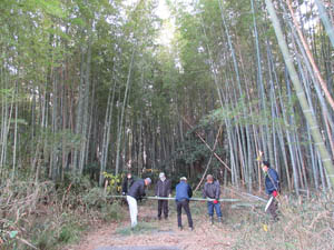 先ずは、門松を作るため組の竹藪で太い竹を選び切り出します