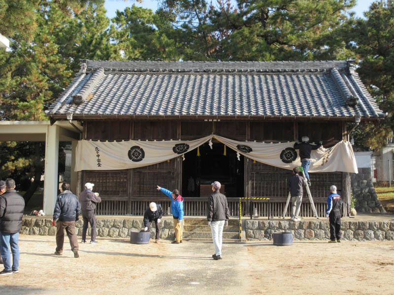 津島社前では、拝殿に幕取り付け、門松造りを始めます