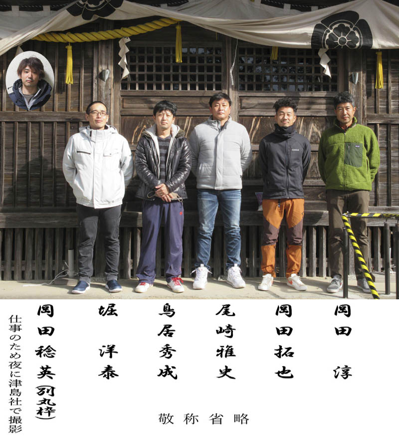 厄年を迎える6名です。1人は仕事の関係で撮影に間に合わず、囲みの顔写真になりました。撮影の時だけマスクを外しました |