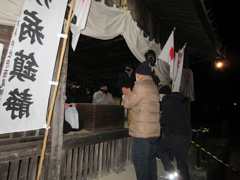 来る新年に厄年を迎える厄年会(6名)による厄払い行事の最終準備です。元旦を迎える0時近くになると、ここ小見行組の氏神さんである津嶋社への参拝者が増えます。今年も見慣れたマスク姿での参拝です。また、今年も甘酒等の口に入るものの振る舞いはなく、氏子の参拝時に菓子等の厄払い記念品を渡していました。