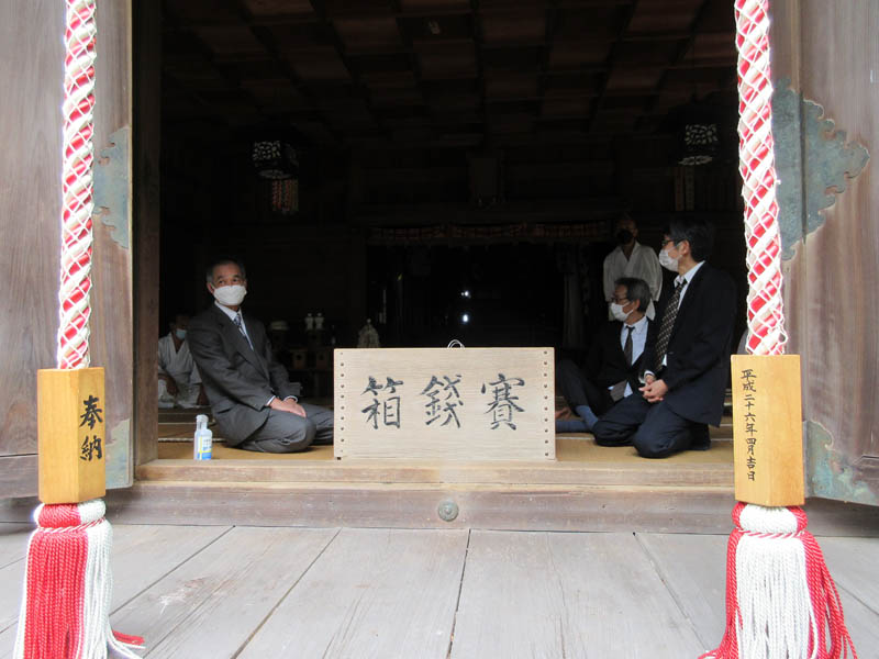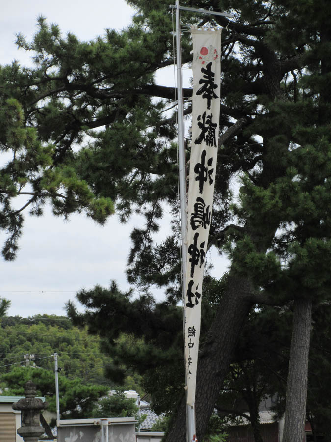 津島社拝殿で準備です。今から幕張、幟立てをします