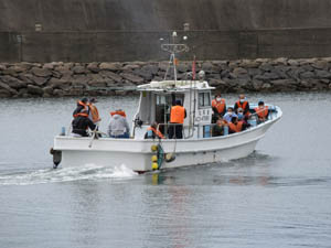 沖島社へは船でないと参拝できません。漁協から観光漁船1隻をチャーターして随時運行です