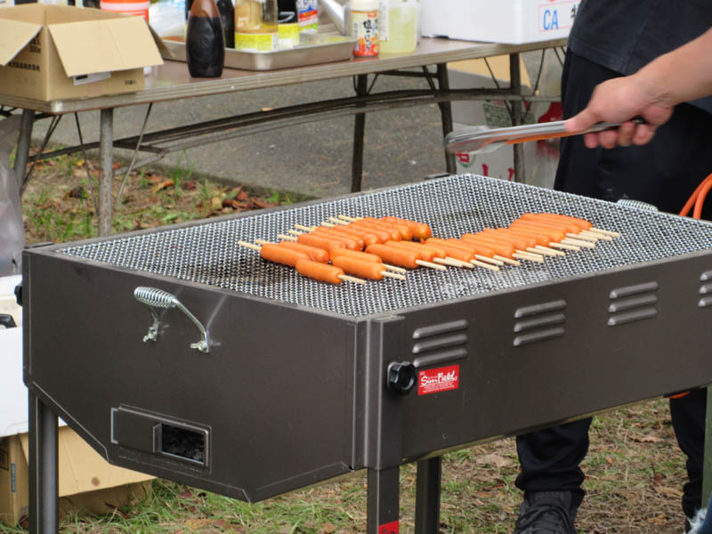 公民館駐車場は津島社境内であり、振る舞いの品を調理します。フランクフルトを焼きます