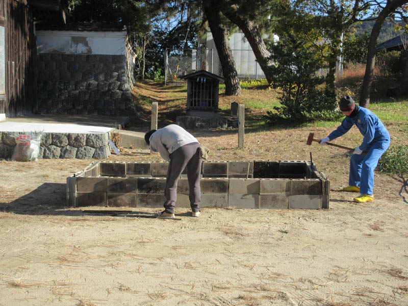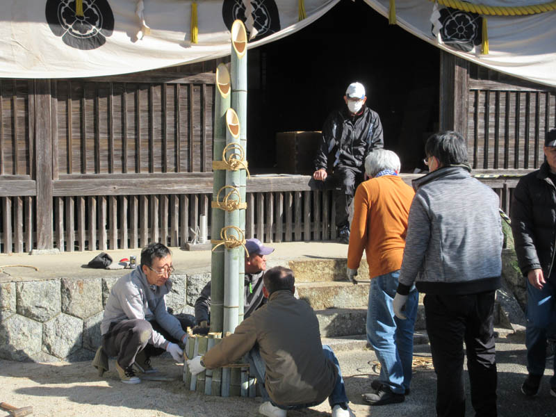 大祓、古札焼納祭の場所作りです。ブロック囲いの中に一年のお札を入れて、ご祈祷を待ちます