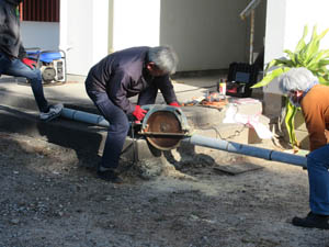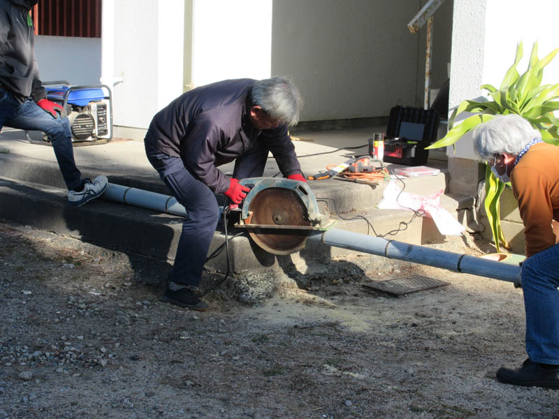 組の竹藪から切ってきた竹を門松用に丸鋸で加工します。笑いのマークが見えるよう注意しての切断です