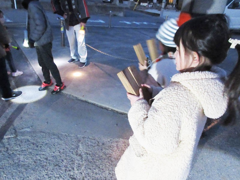 「火の用心」を大声で発声し、拍子木を打ちます(声も拍子木もいいのに写真がぶれてしまいゴメン!)