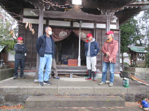 大晦の朝、ボランティア団体「愛宕会」による塚越観音堂の草刈り、清掃があります。会長と小見行組長の挨拶があってスタートです