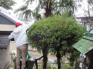 垣根の枝葉をバリカンでそろえます