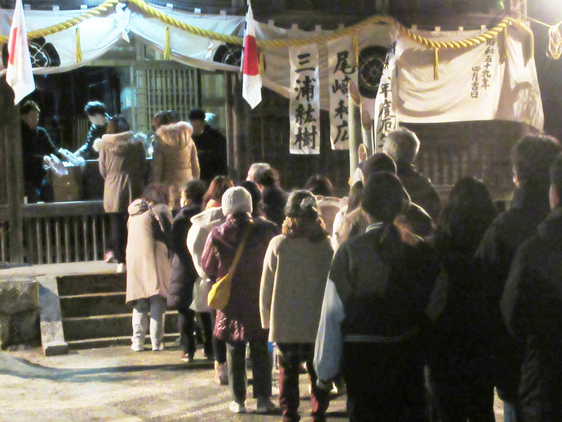元旦0時近くになると、参拝者が増えます。参拝者の接待は厄年の2人が行い、振る舞いの品を渡していました。参拝者の列ができていました。新年の家内安全、商売繁盛、疫病退散を願います。以前より間隔を取って参拝を待ちます(これが普通になりました)