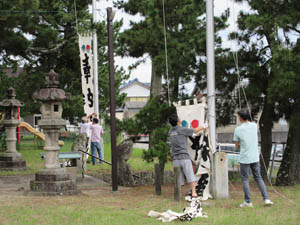 準備は、幟竿立てから始めます。祇園祭は津島社の祭典なので津島社の幟を上げます