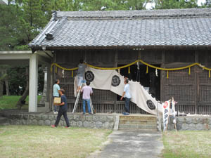 拝殿に祭礼の幕を取り付けます
