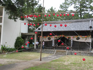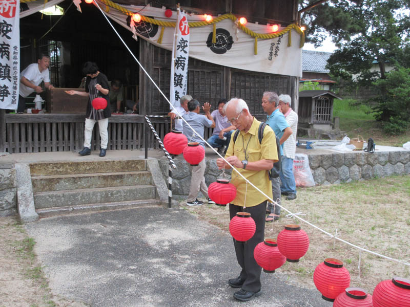17時から浅井宮司により式典が執り行われ、その後は町内の氏子が参拝し、灯の着いた提灯を受け取り、本殿と鳥居を結ぶ綱に結んでいました。