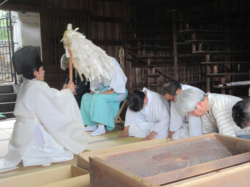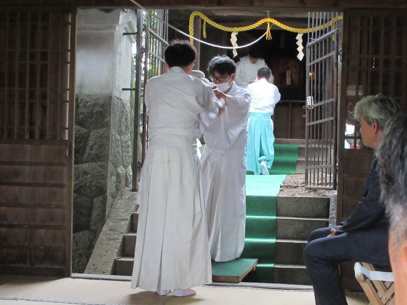 献饌の儀でお供え物を本殿に上げます。神職だけでなく、小見行組の神社部役員が手伝います