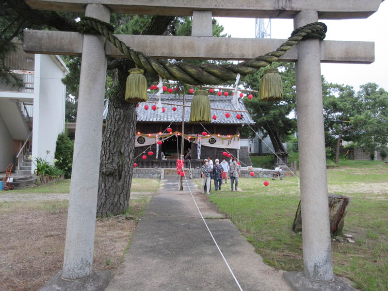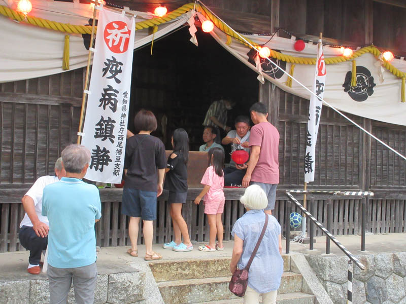 入り口鳥居から津島社を眺めました。天の字の提灯がよく見られます。猛暑に中、焼きそば付きの祇園祭も人気の中、終わろうとしています。地区内氏子の家内安全、商売繁盛、交通安全、さらに疫病鎮静を祈念します。久々に盛り上がった祇園祭でした |