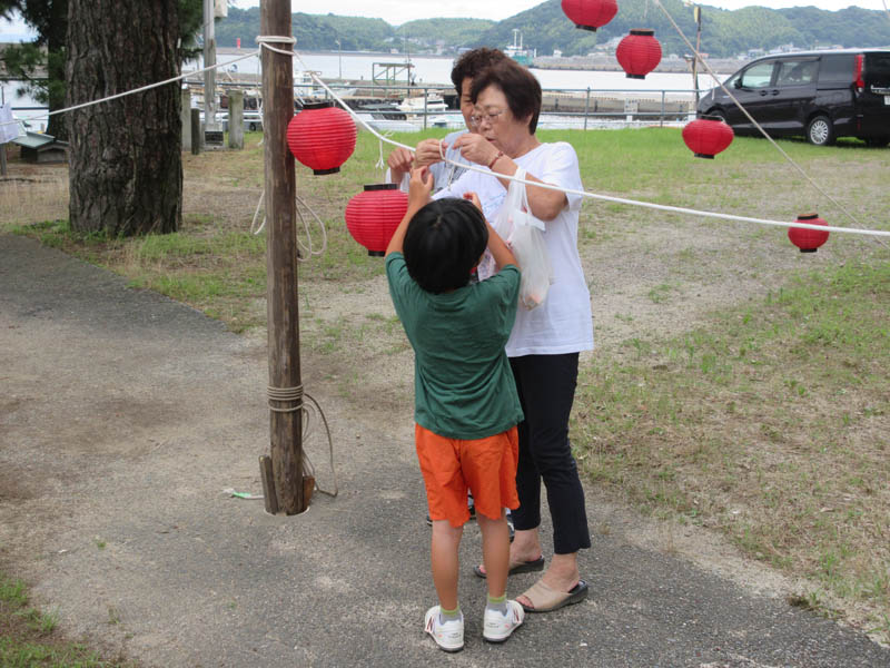 子供も参拝の後、提灯を結びます。しかし、子供だけでは危ないので、親御さんやじいちゃんばあちゃんが、手伝います