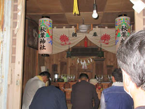 ![]() 祭礼の準備ができました。神社委員長が祝詞を上げ、地区の火災防止、安全を祈願します |