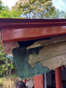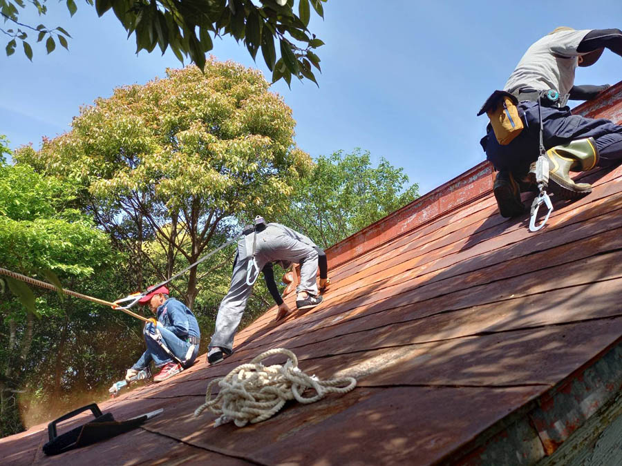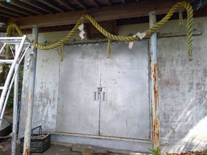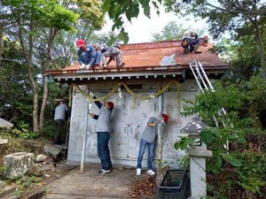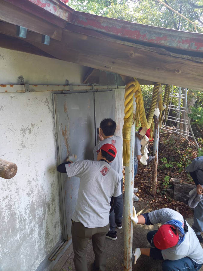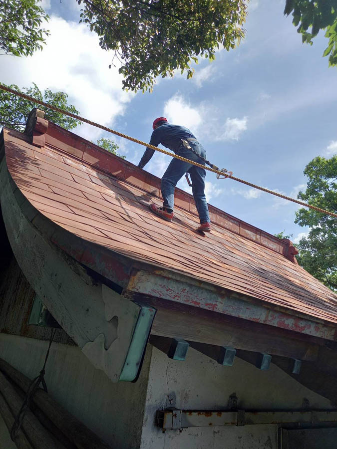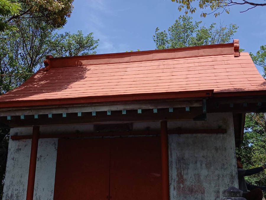 ただ、社の傷みが激しくなり、特に屋根の錆がひどくなっていました。そこで、今回も5月例会として思い切って、社のペンキ塗りを行いました。今回はペンキ剥がし、下地塗りを行いました。高所なので大変でしたが、きれいになりまして、麓からも下地塗りだけどきれいに見えるようになりました。お疲れ様でした。